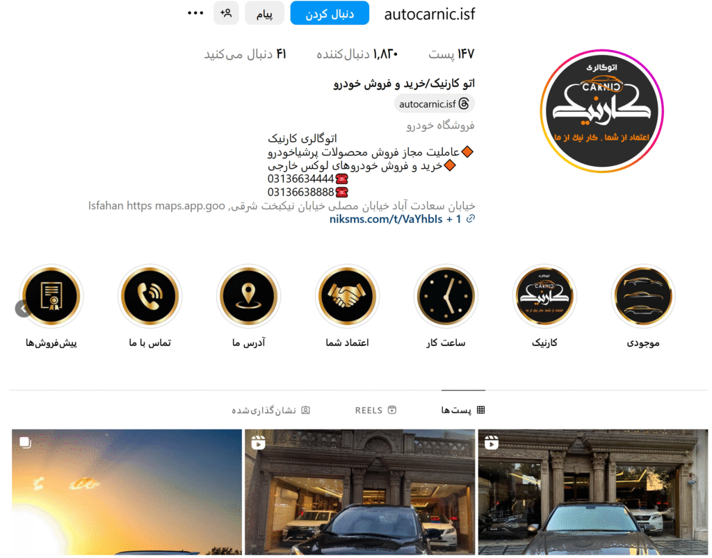 | 3 | اتو کارنیک | اصفهان، شهید نیکبخت شرقی، بین دهقانی و غدیری | 03136634444 | 9 تا 14 و 17 تا 22 | – | – | @autocarnic.isf |
