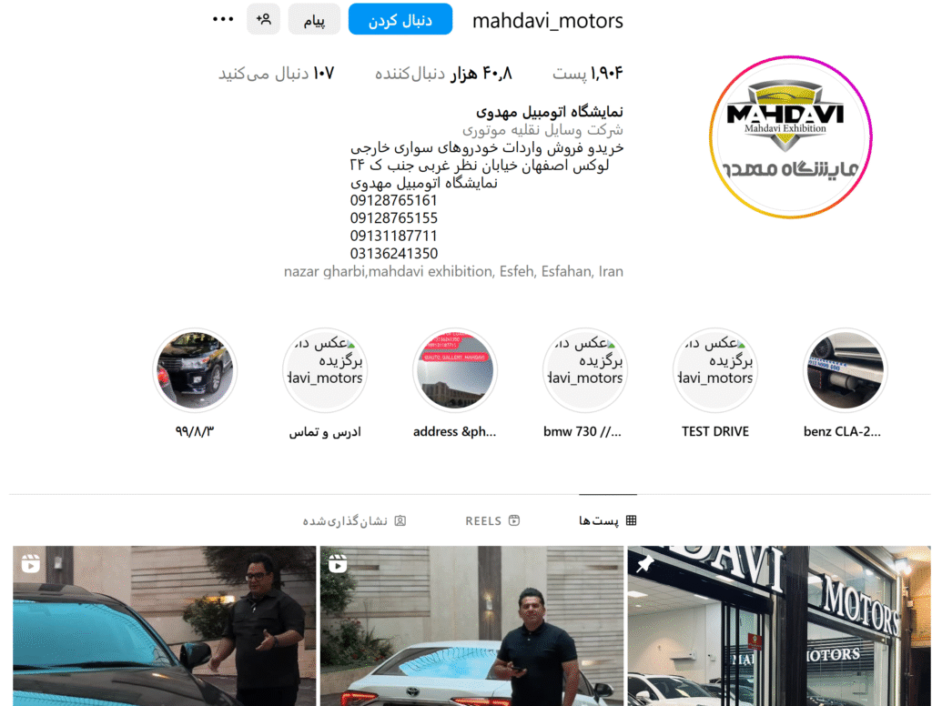| 5 | Mahdavi Motors | اصفهان، نظر غربی، سیروس | 03136241355 | 9 تا 14 و 17 تا 22 | – | – | @mahdavi_motors |